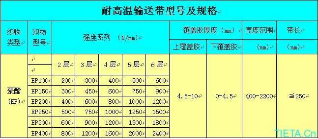 根据用户要求,可设计不同温度耐高温带。耐热输送带是由多层橡胶棉帆布(涤棉布)上下覆有耐高温或耐热橡胶、经高温硫化粘合在一起,在180℃以下正常使用条件下,伸长变形小,磨耗性能优异。在短时间内可承受250℃高温。适用于水泥、焦化、冶金、钢铁等工业使用。