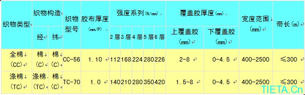 二、用途 该产品是由多层挂胶帆布(涤棉、尼龙或EP等强力层)按一定结构粘合在一起,外表加贴不同性能的覆盖胶层,经加热硫化而制成的橡胶产品,他是输送机的主要部件,用于运载物料,适用于输送中小矿石、原煤、焦炭、砂砾、粉末等物料。 三、规格及技术参数